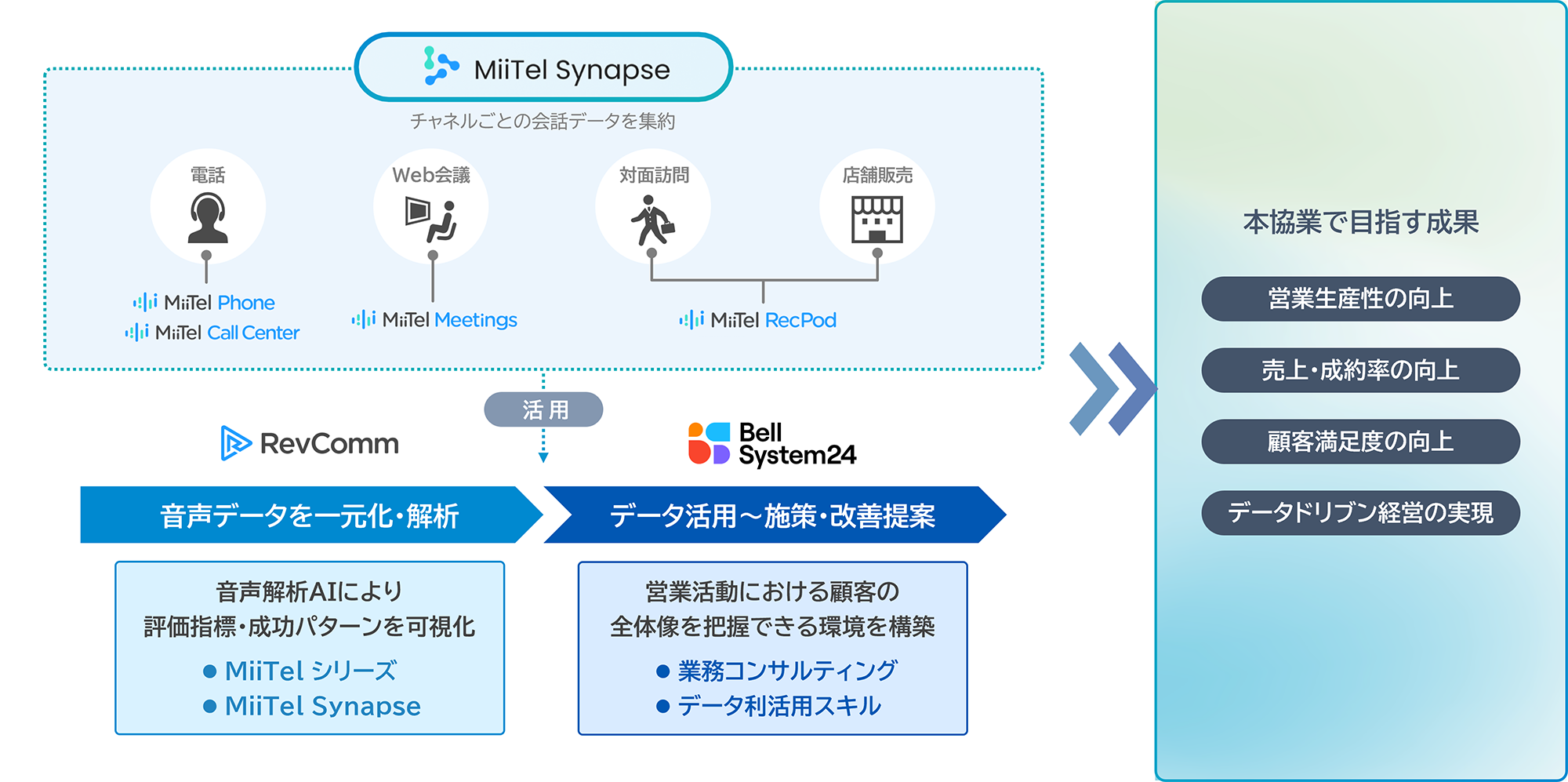 本協業では、「MiiTel」シリーズを基盤に、ベルシステム24が持つ業務コンサルティングやデータ利活用のスキルを組み合わせることで、データに基づいた営業活動における顧客の全体像を把握できる環境を構築し、営業のデータ活用を支援する共同サービスを提供予定です。リアル・オンラインの垣根を超えて営業活動で発生したコミュニケーションデータを一気通貫で利活用できる点が特徴で、これにより、営業現場の生産性向上、売上拡大、顧客満足度向上に直結する改善策を提供するとともに、経営判断に活用できるデータドリブンな仕組みを実現します。