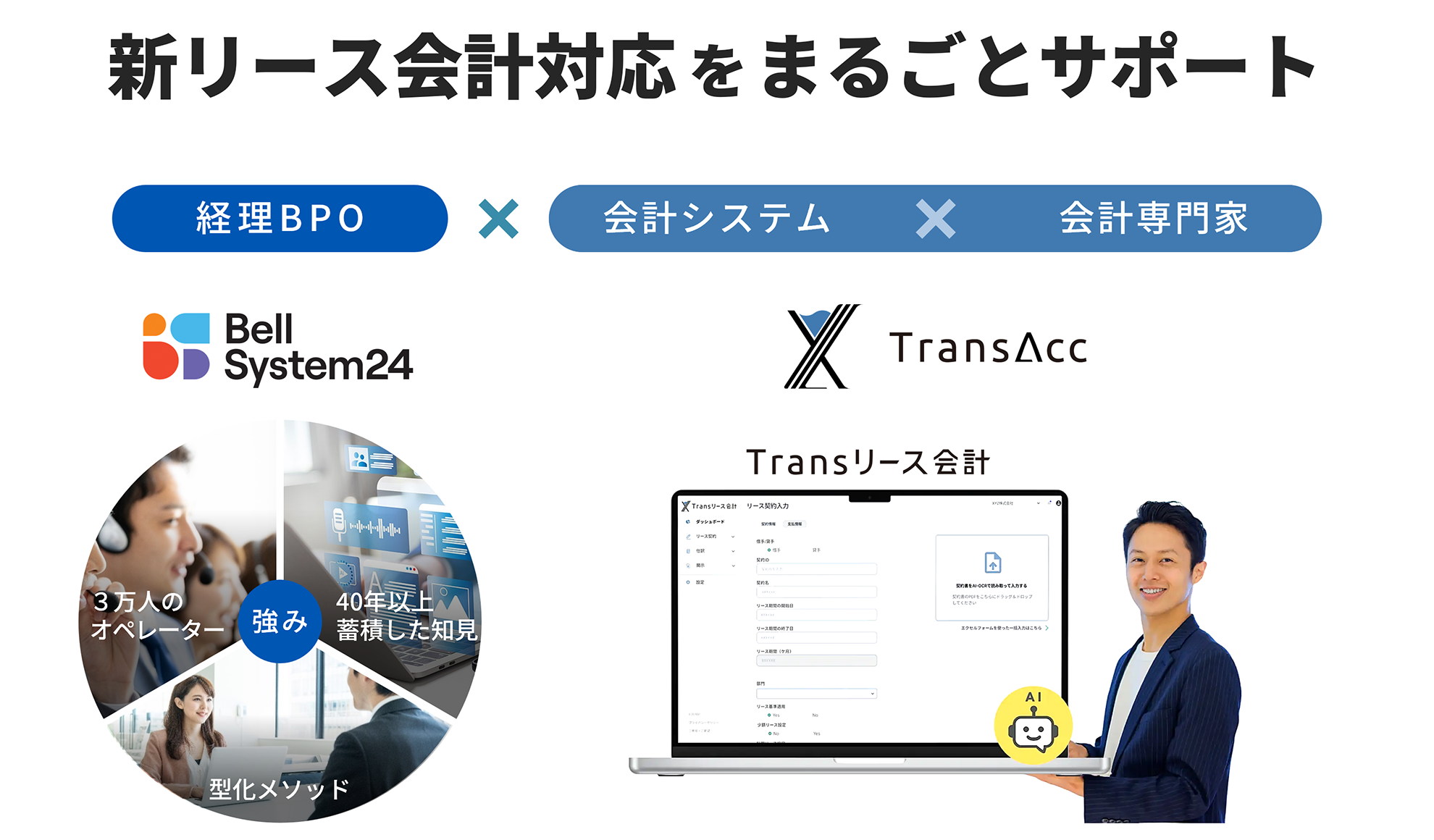 株式会社ベルシステム24(本社:東京都港区、代表取締役 社長執行役員:梶原 浩、以下:ベルシステム24)は、株式会社トランザック(本社:東京都新宿区、代表取締役:土間 航輔、以下:トランザック)が提供する新リース会計基準に特化したAI搭載自動仕訳・注記作成ツール「Transリース会計」を活用した、新リース会計対応のまるごとサポートサービス(以下:本サービス)の提供を開始します。