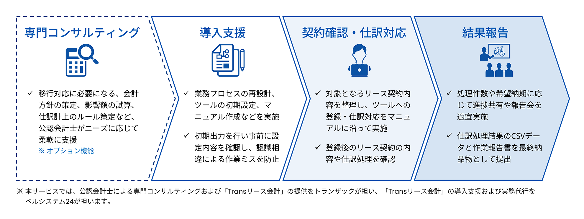 基準改定による追加業務のリソースに課題がある企業に向けて、移行期から運用期の2段階を見据え、トランザックの公認会計士による専門コンサルティングと、ベルシステム24が業務プロセスの整理や初期設定といった「Transリース会計」導入支援から、移行期に一時的に発生する既存リースの契約確認・登録、仕訳データの作成といった実務作業を人手によって支援することで企業の負担軽減を図ります。